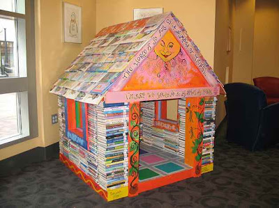 This Library playhouse is just the right size for young children to explore and was built out of hundreds of discarded children’s books by Nathan Nissen, a University of Iowa Civil Engineering graduate student. The Book Nook was finished and painted by Iowa City artist Deanne Wortman and her woodworker son, Eric Wortman.